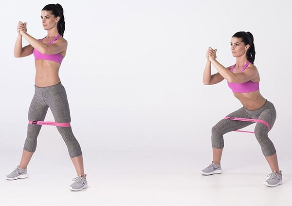 Tiếp theo, ta thực hiện động tác Sumo Squat. Đây là một biến thể của động tác Squat, có tác dụng tập trung vào phần đùi nhiều hơn. Trong động tác này, hai chân ta sẽ mở rộng hơn vai, mũi chân hướng chéo sang hai bên. Khi hạ người ta hạ xuống đến mức đùi vuông góc với cẳng chân. Giữ nguyên tư thế này 1 giây sau đó đưa cơ thể về vị trí ban đầu.